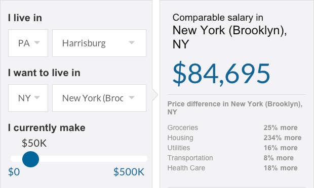 Sites like CNN Money and Salary.com have cost of living calculators to help you determine just how far your salary will go in your new home. They’re useful in determining whether you’ll have a comparable net income after you factor in common expenses such as groceries, housing, and utilities. As an example: a $50,000 salary in central Pennsylvania would need to increase to a whopping $84,000 in Brooklyn in order for you to maintain the same quality of life.