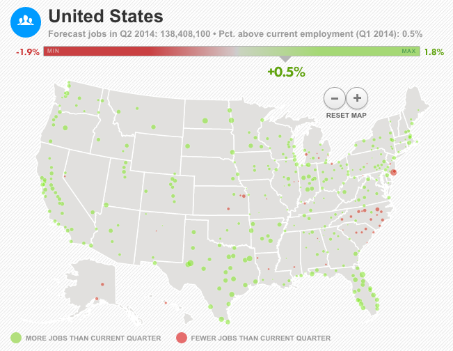 Financial considerations go far beyond your salary and cost of living. Between the first and second quarters of 2014, nationwide employment rose by about 0.5%. That’s a nationwide average, though, and shouldn’t be too heavily factored into your calculations.More useful would be the jobs forecast for the area you’re thinking about moving to. USA Today put together an interactive map, which it updates monthly, to put the spotlight on job growth in a variety of industries across the country. When you’re researching the economic climate of your new home, this map should be your first step.