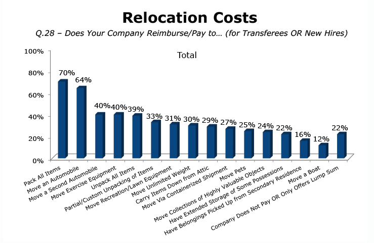 That said, you may be able to support this relocation on your employer’s penny. While employer relocation budgets have been decreasing each year, nearly 59% of employers still offer a full reimbursement approach. Others, as this chart from Atlas Van Lines shows, offer some form of compensation. Don’t be afraid to ask (or negotiate) for these expenses.